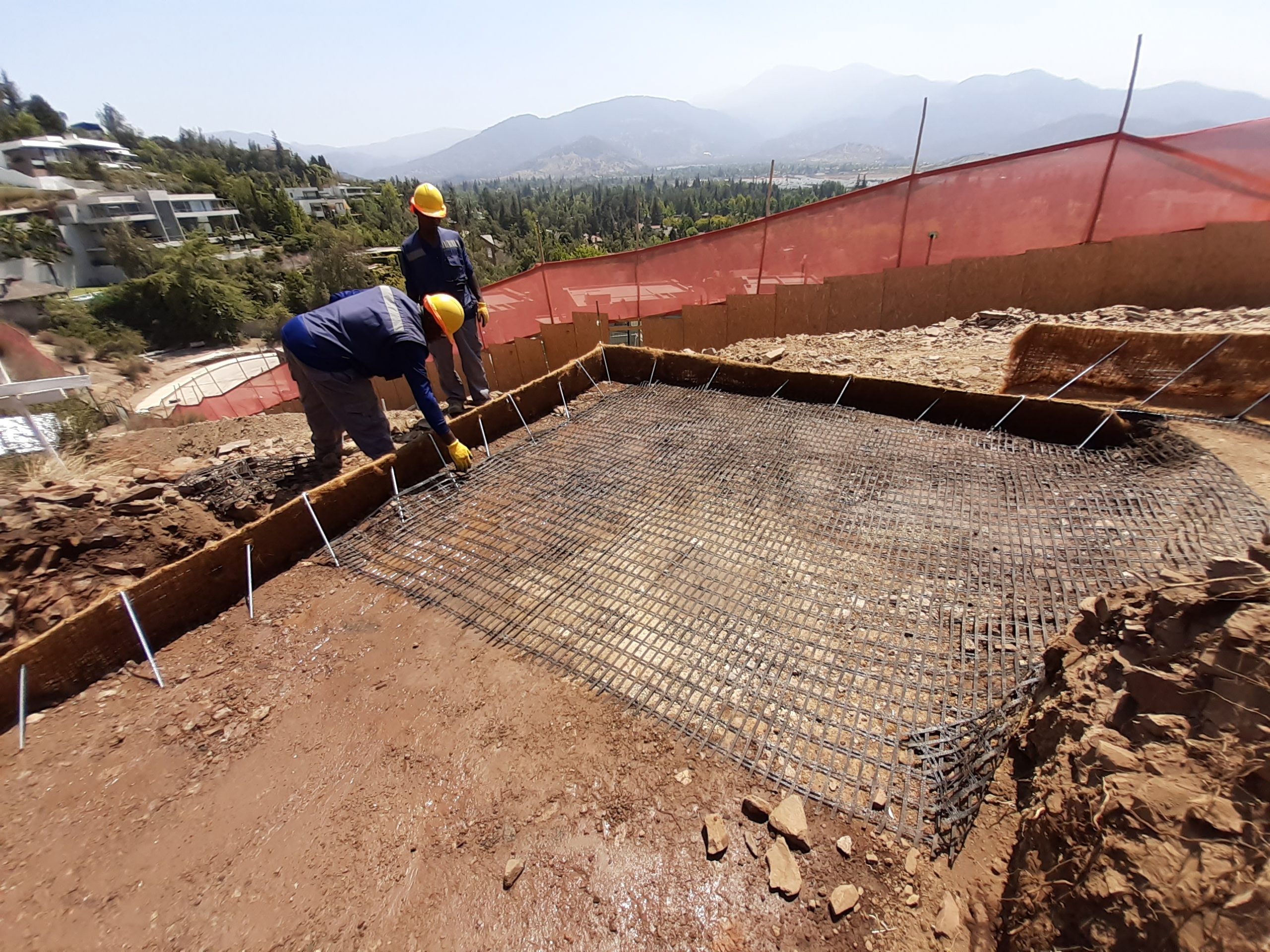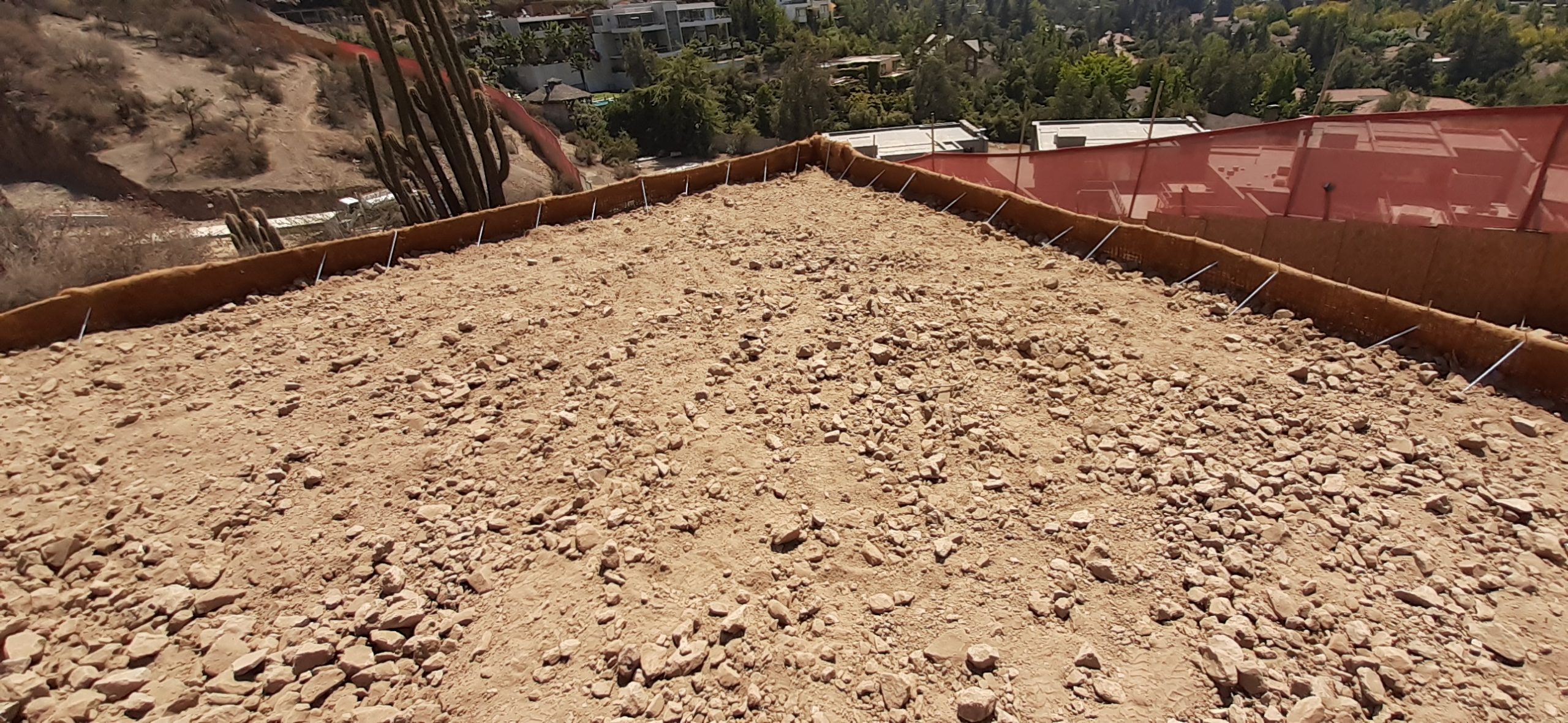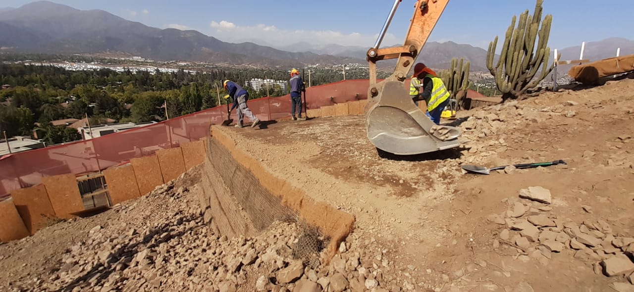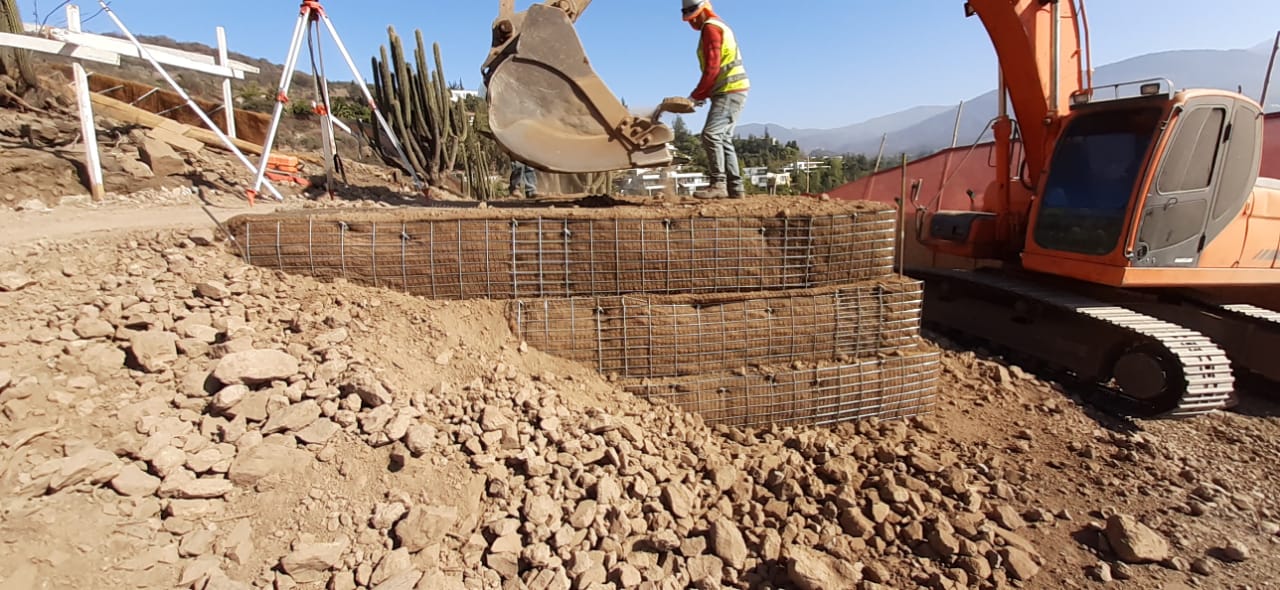 En este proyecto haremos una serie de muros TEM (Tierra Estabilizada Mecánicamente), tanto ECO para contención de áreas verdes como Lock+Load para zonas viales, para distintas casas y calles dentro del condominio que se está construyendo en el sector de Lo Barnechea en Santiago. Este muro en específico es para las casas 4 y 5 y estamos construyendo, supervisando y proveyendo todo el material necesario para su ejecución.