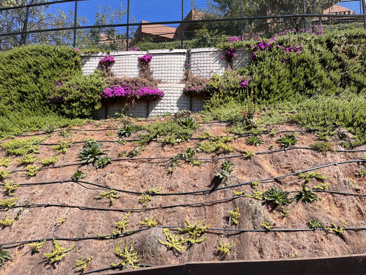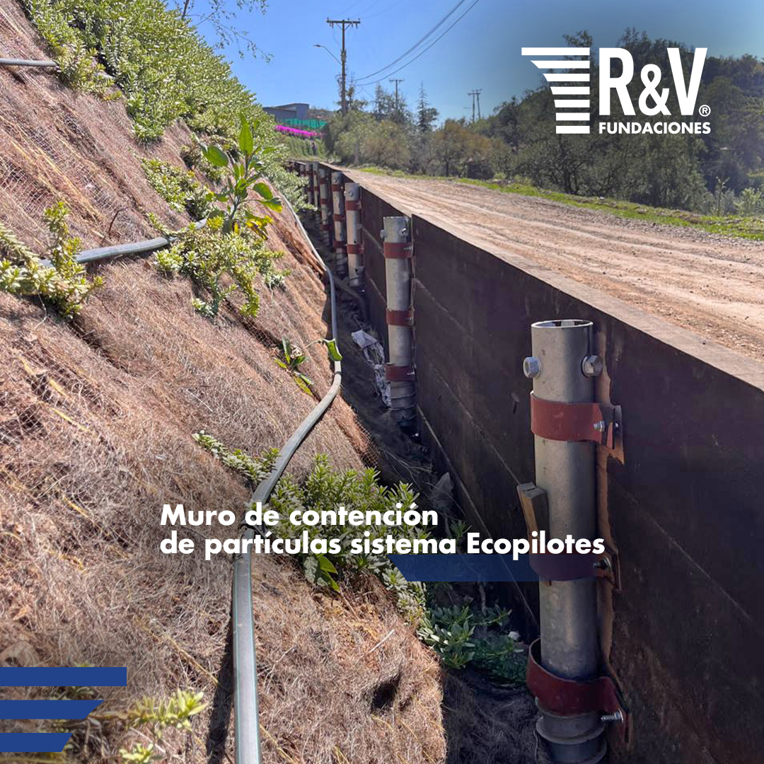 2.-R&V Ecopilotes: Muro de contención construido con ecopilotes de 1.60 m de longitud, instalados a intervalos de 1.60 m, utilizando maderas tratadas de 2”x8” fijadas con pernos galvanizados en U. Esta solución fue diseñada para contener rodados y garantizar la seguridad del tránsito vehicular, además de reforzar taludes con Gavionflex en áreas superiores, brindando estabilidad adicional para deslindes y patios adyacentes.