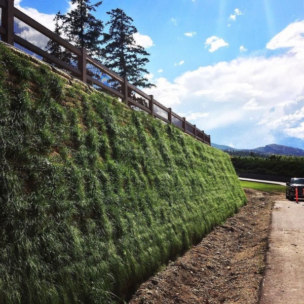 Muros de contención construidos en base al sistema de Tierra Estabilizada Mecánicamente (TEM), compuestos por el reforzamiento de los taludes por medio del intercalamiento de refuerzos estructurales de Geogrillas de Polyester StrataGrid®.